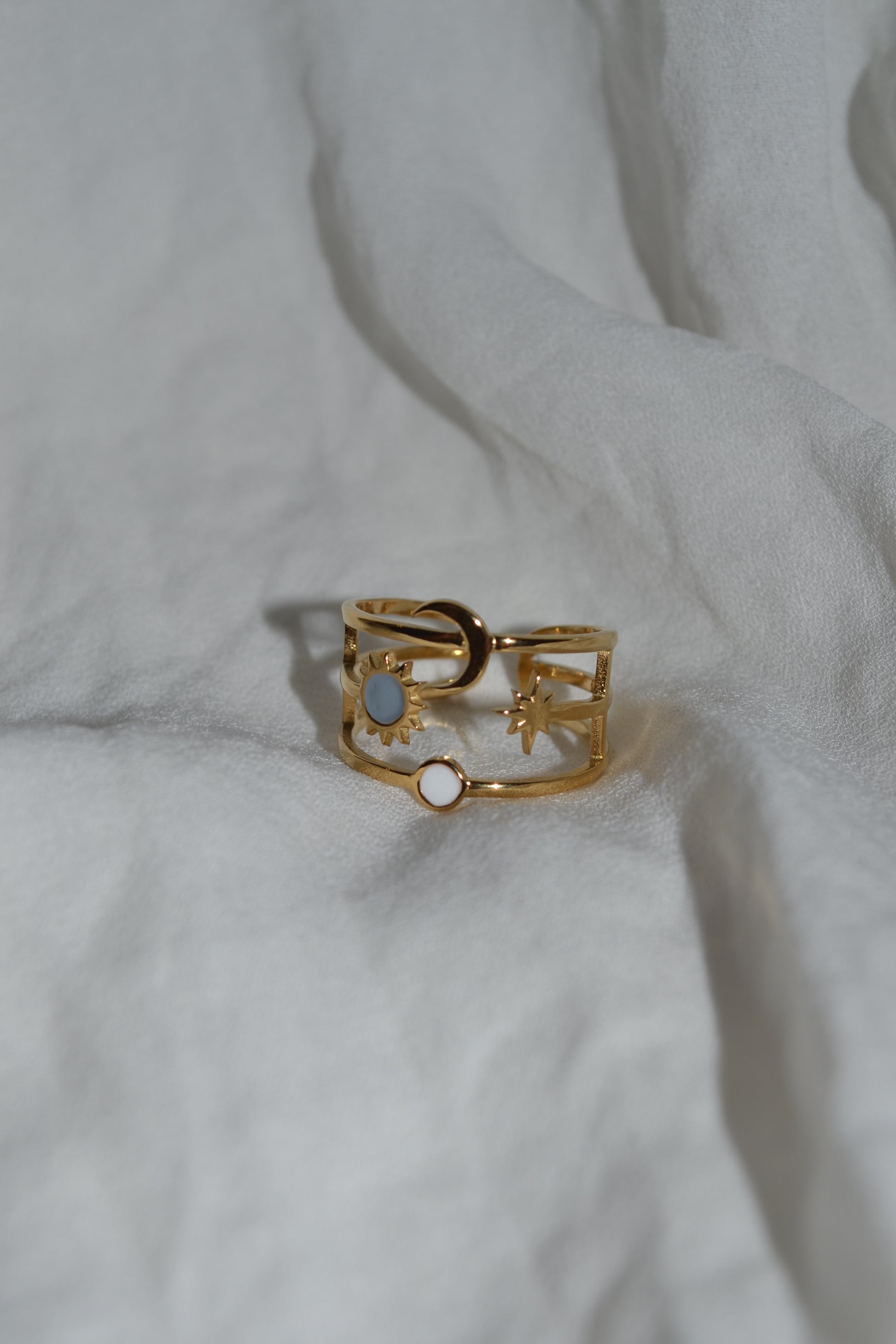 Bague triple ligne lune soleil étoile nacre. Tous nos produits sont fabriqués en acier inoxydable, un matériel qui résiste à l'eau et au temps. Ajustable à toutes les tailles