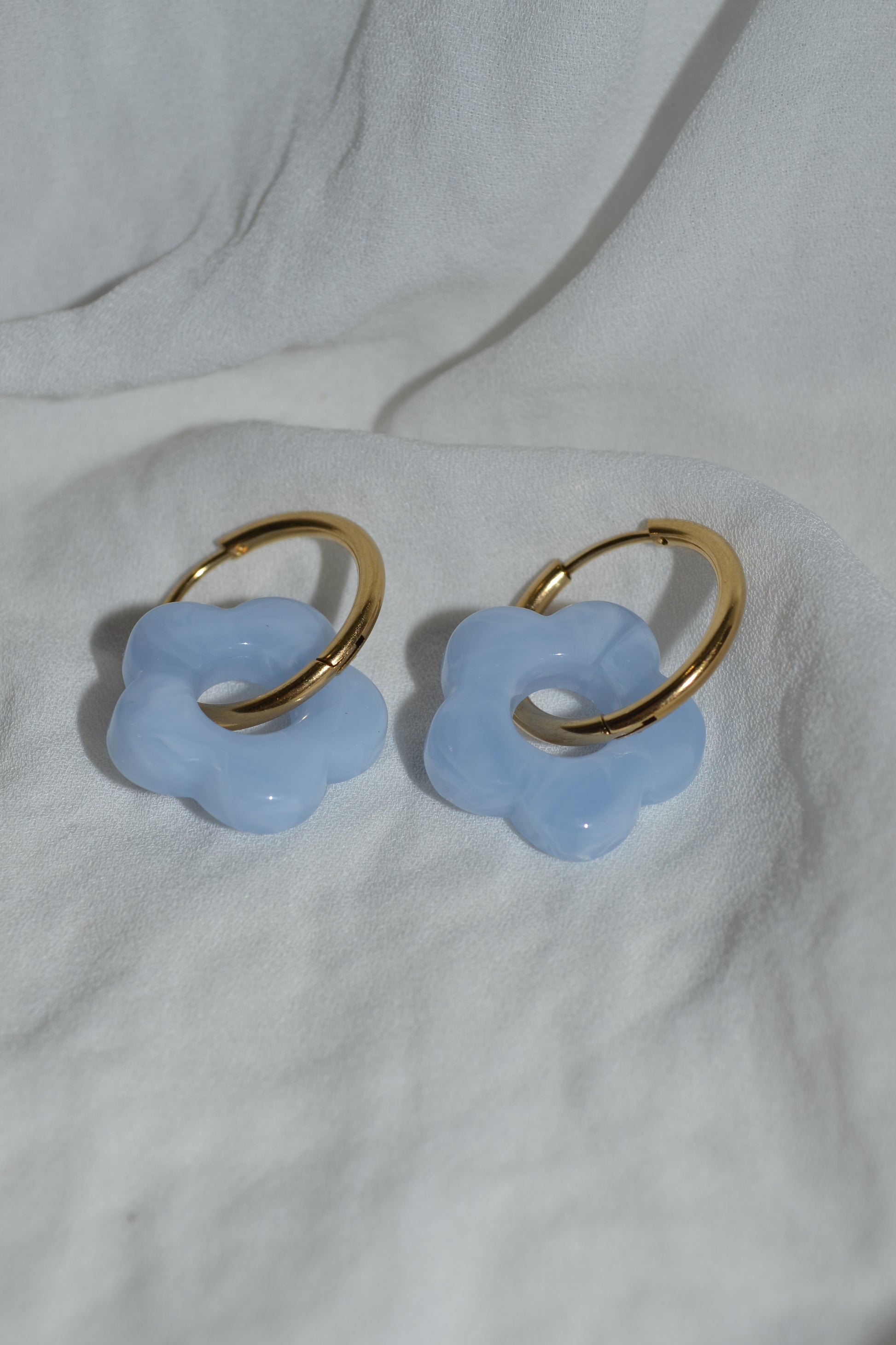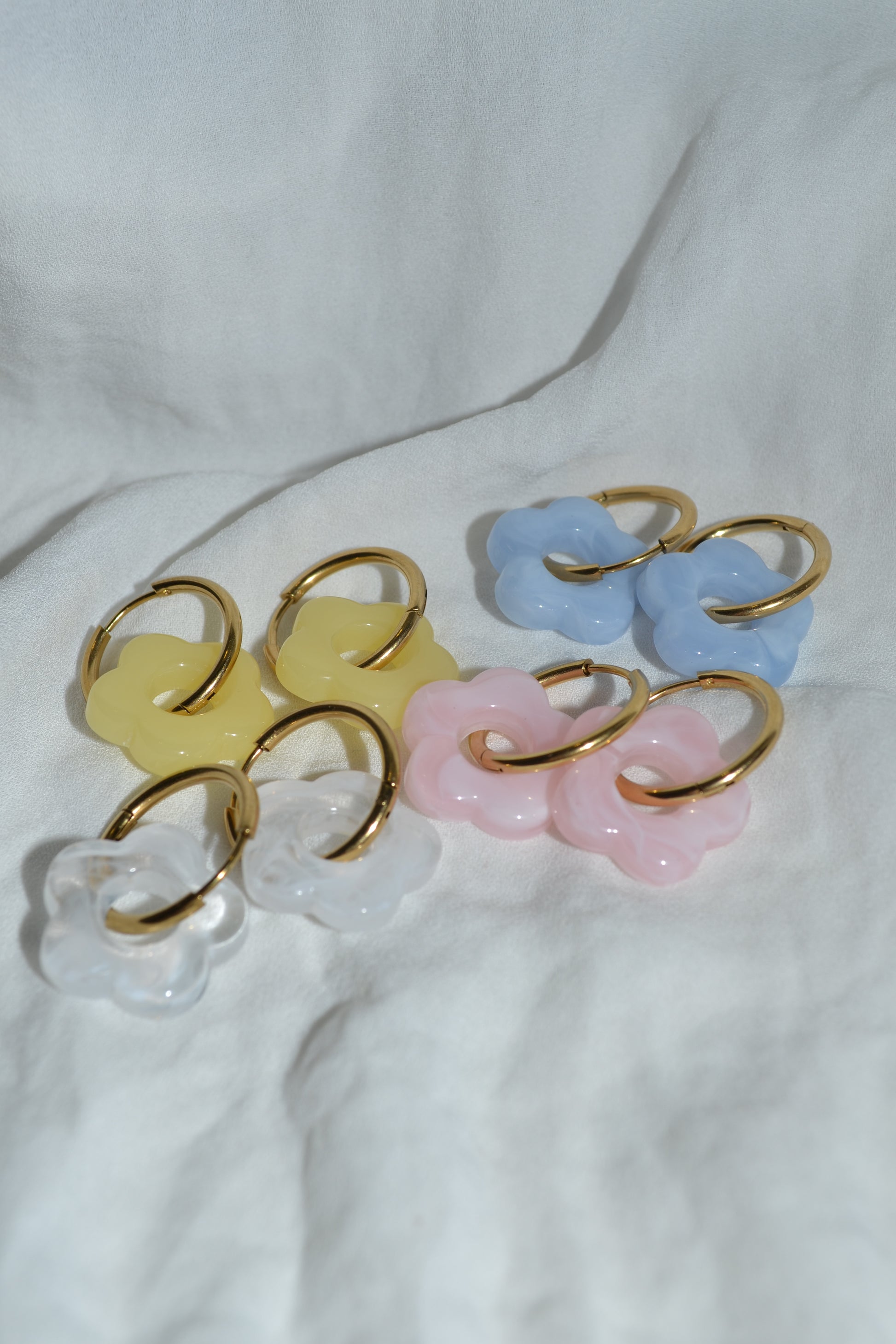 Boucles d'oreilles créoles fleur résine blanche, bleu, rose et jaune. Tous nos produits sont fabriqués en acier inoxydable, un matériel qui résiste à l'eau et ne se rouille pas dans le temps. Ils sont garantis sans nickel, sans cadmium et sans sel de plomb.