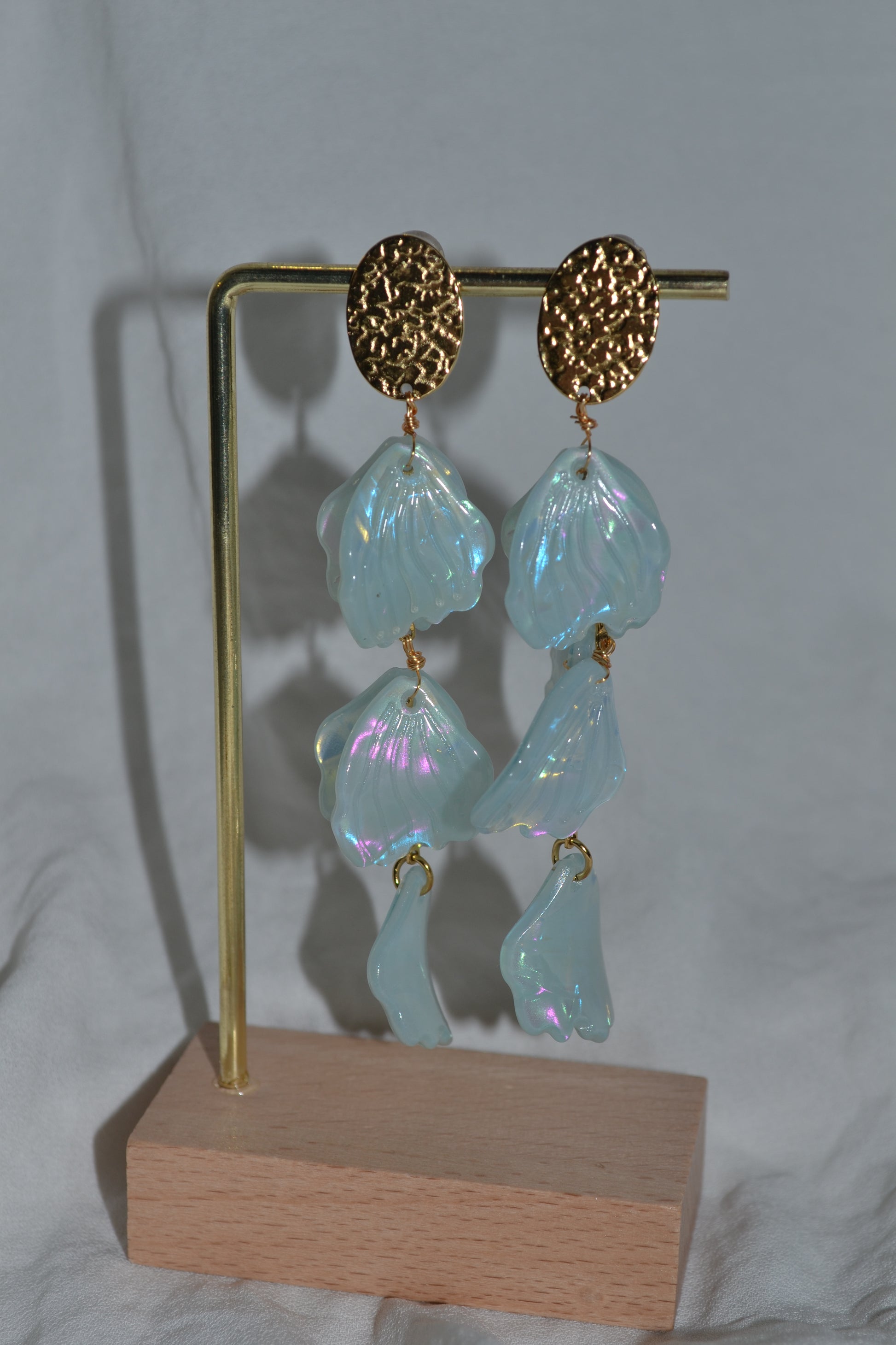 Boucles d'oreilles dorées pendantes avec pétales blanche Bleu et Rose. Tous nos produits sont fabriqués en acier inoxydable, un matériel qui résiste à l'eau et ne se rouille pas dans le temps. Ils sont garantis sans nickel, sans cadmium et sans sel de plomb.