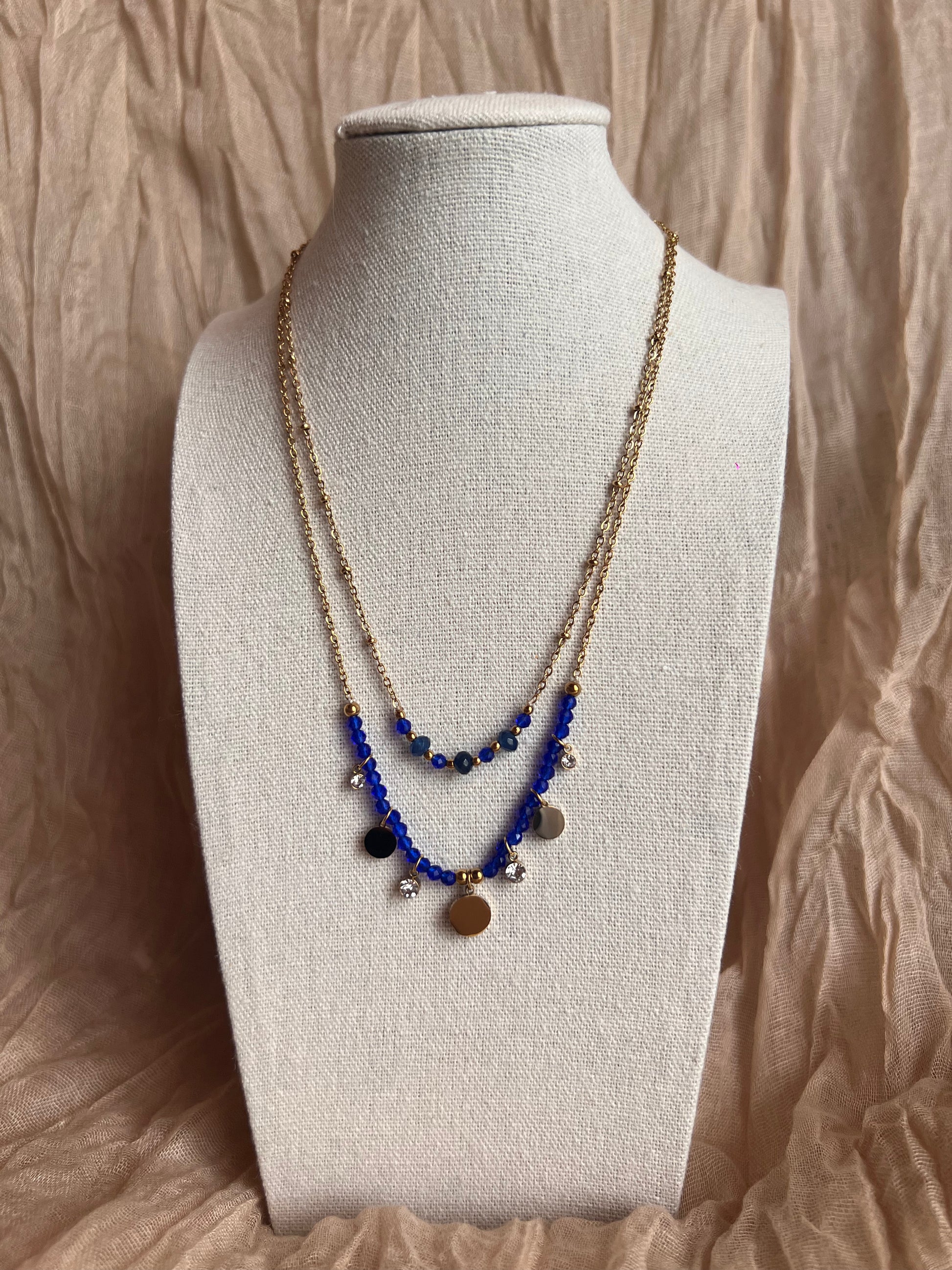 Collier Doré Double Chaînes Cristaux Verts et Bleu. Tous nos produits sont fabriqués en acier inoxydable, un matériel qui résiste à l'eau et au temps.