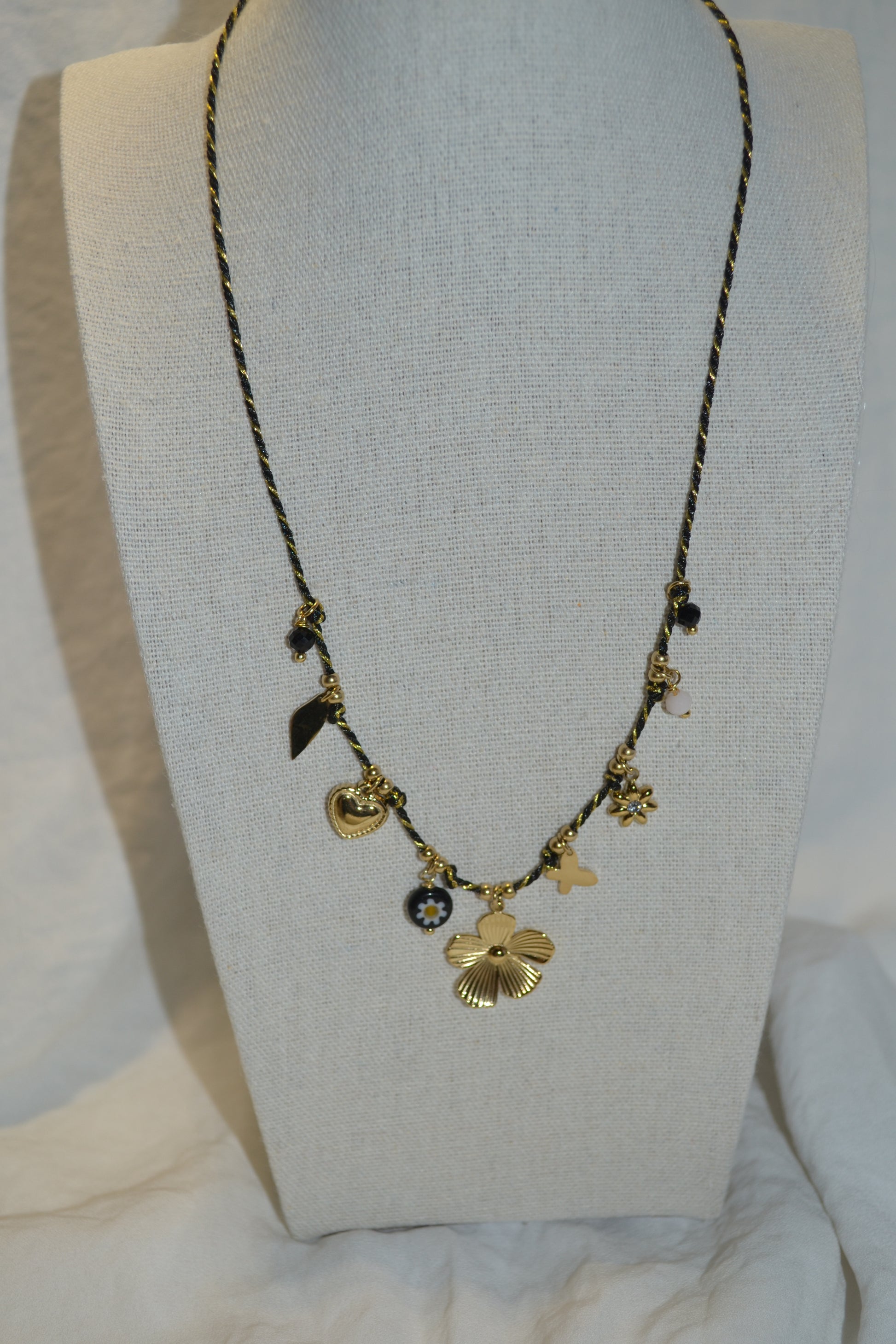 Collier Doré Tressé Fils Noir Et Doré avec Fleurs